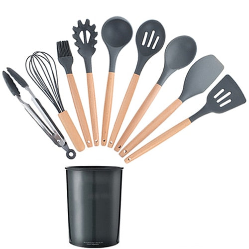 Wood cooking utensils set: Silicone Cooking tools
